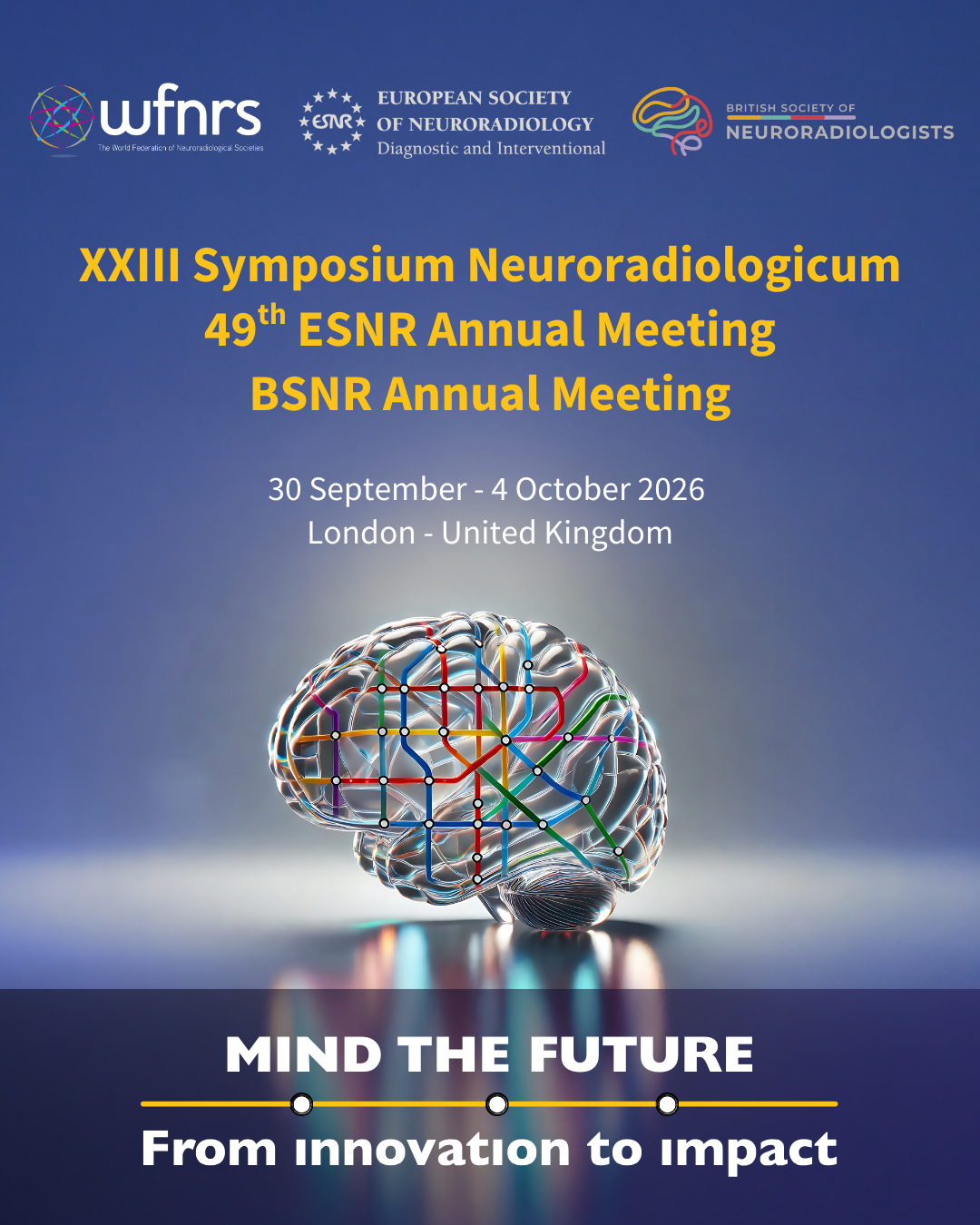 The European Society of Neuroradiology’s 49th Annual Meeting & World Federation of Neuroradiological Societies (WFNRS) XXIII Symposium Neuroradiologicum is organized by the European Society of Neuroradiology, and will be held from September 30th to October 4th 2026 at the QEII Conference Center in London, United Kingdom.